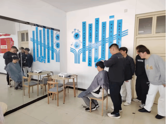 员工之间的互相理发由大家自由组队,一人操作,旁边同学围观评说,从生疏到熟练,每一个动作都倾注着认真与专注。在同学们鼓励声中,从最初的紧张羞涩,到后来的自信满满,不仅发型变得清爽利落,彼此间的友谊也在这一推一剪中愈发深厚。